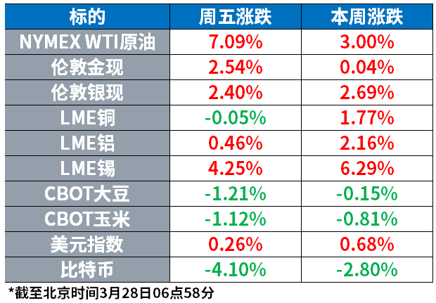 大宗商品也跟随战局摇摆,美国WTI原油期货周五全天持续走高,最终突破100美元整数关口;黄金、白银也在本周支撑位附近反弹。比特币连跌两日后,又回到6.6万美元附近。